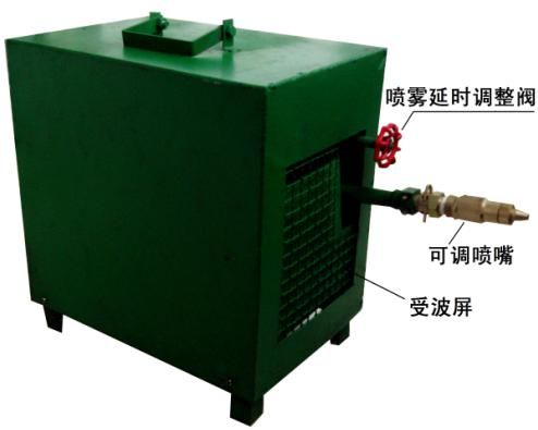 本裝置設(shè)計為一體化,有進水閥門、噴霧時間調(diào)整閥門等組成,當迎頭放炮時震動沖擊波沖擊機械放炮噴霧裝置的受波屏,進水閥門打開,開始噴霧,同時水源又給進水延時水箱注水,由于延時水箱與所配墜鐵比重偏移,水箱的水滿后,水箱逐漸傾斜并緩慢放水,從而逐漸減少噴霧延時時間,水箱的水流盡后,噴霧停止,直至下一次放炮,再次循環(huán)實現(xiàn)噴霧過程。噴霧延時水箱有進水調(diào)整閥門,調(diào)整此閥門可調(diào)整噴霧時間。